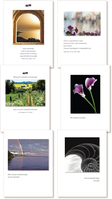 Sympathy assorted pack of 6 – includes these designs (no substitutions): 1119SYa - Love is immortal. Loss is only a horizon and a horizon is nothing save the limit of our sight. inside With deep and sincere sympathy.1081SYa - There is a sacredness in tears. They are not the marks of weakness, but of power. inside With sadness, and deep sympathy for your loss1091SYa - Wherever a beautiful soul has been there is a trail of beautiful memories. inside With sympathy, deep sympathy.1023SYa - With deepest sympathy… inside Please accept this quiet love.1036SYa - When we see wonderful light, we will remember… inside With deepest sympathy for your loss1034SYa - A life of beautiful order, and light inside With deepest sympathy for your loss