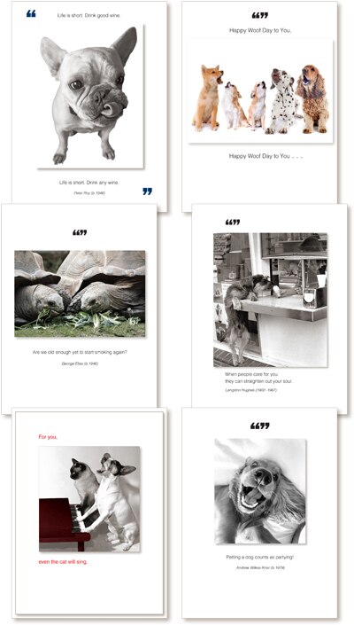 Birthday/All Occasion assorted pack of 6 – includes these designs (no substitutions):760HBa - Life is short. Drink good wine. Life is short. Drink any wine.1090HBa - Happy Woof Day to You, Happy Woof Day to You…1171HBb - Are we old enough yet to start smoking again?297b - When people care for you they can straighten out your soul.913HBa - For you, even the cat will sing.1134HBa - Petting a dog counts as partying!