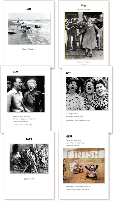 Birthday/All Occasion assorted pack of 6 – includes these designs (no substitutions):1187HBb - Happy Birthday…863HBa - The older the fiddle, the sweeter the tune.1189HBb - Never lie about your age. Tell everyone you're as old as I am. Then lie about my age.1186HBa - At our age, honey, we can say what we want.1132HBa - Say Cheese!1099HBa - What lies behind us and what lies before us are small matters compared to what lies within us.